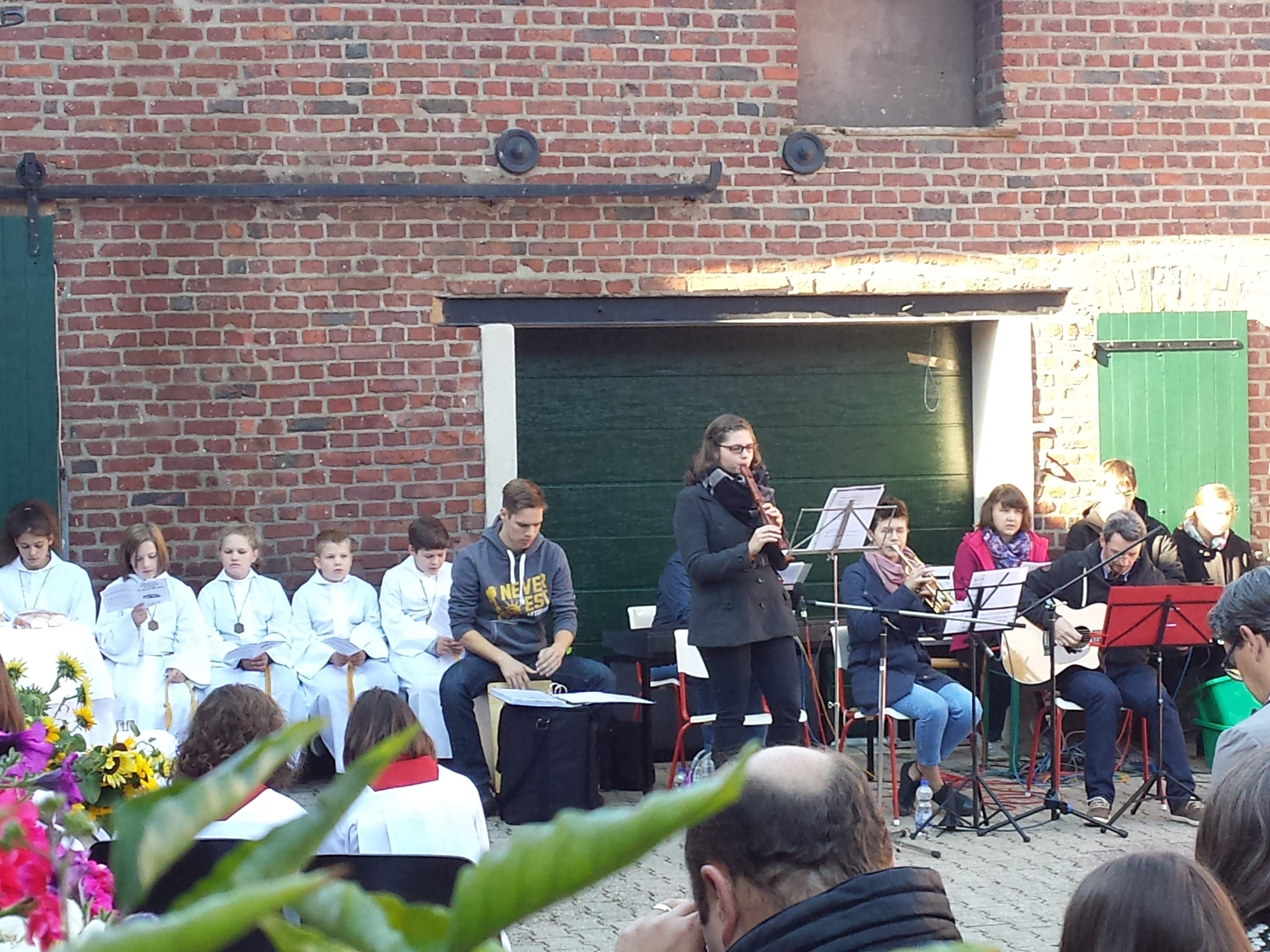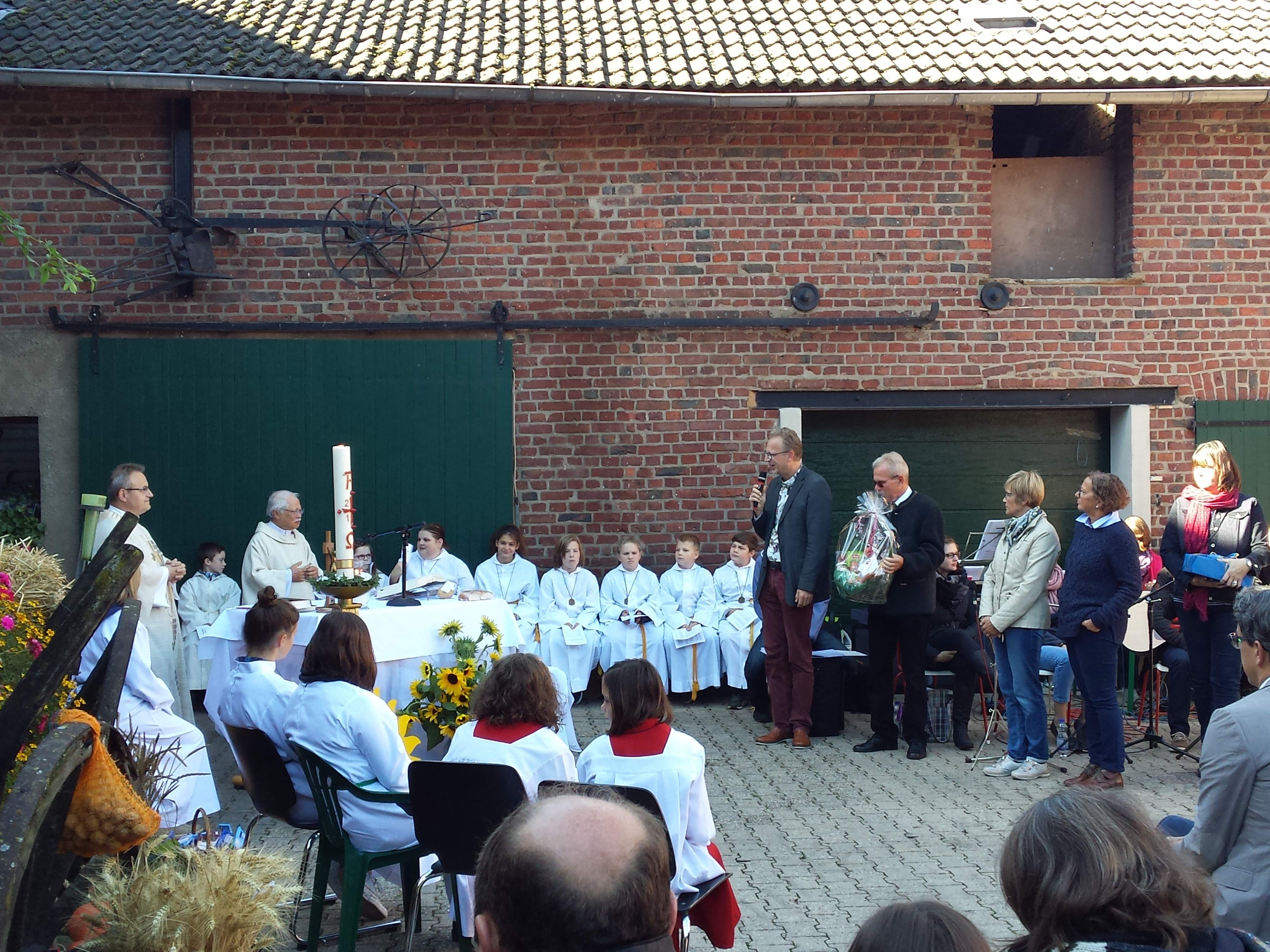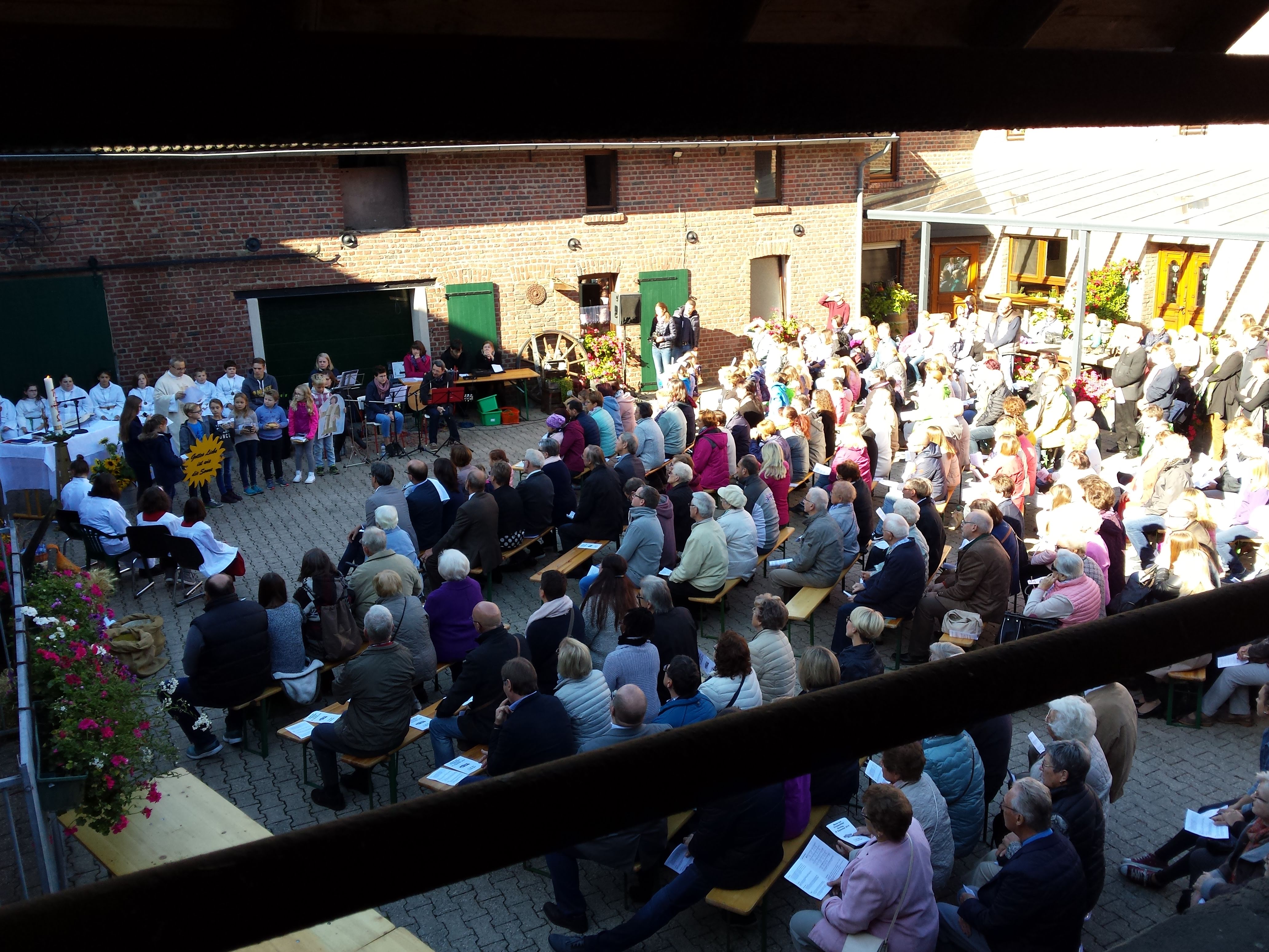 Am Sonntag den 30. September 2018 feierten wir dieses Jahr die Heilige Messe zum Erntedankfest unserer 5 Pfarrgemeinden in Oberzier. Auf dem Bauernhof der Familie Brauers am Dorfplatz reichten die Sitzgelegenheiten kaum aus, so groß war der Andrang bei sonnigem Wetter.